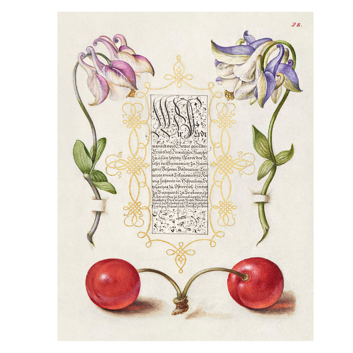 Decorative "European Columbines and Sweet Cherry from The Model Book of Calligraphy (1561–1596)" by Joris Hoefnagel Poster | High-Quality Print | Repositionable Adhesive